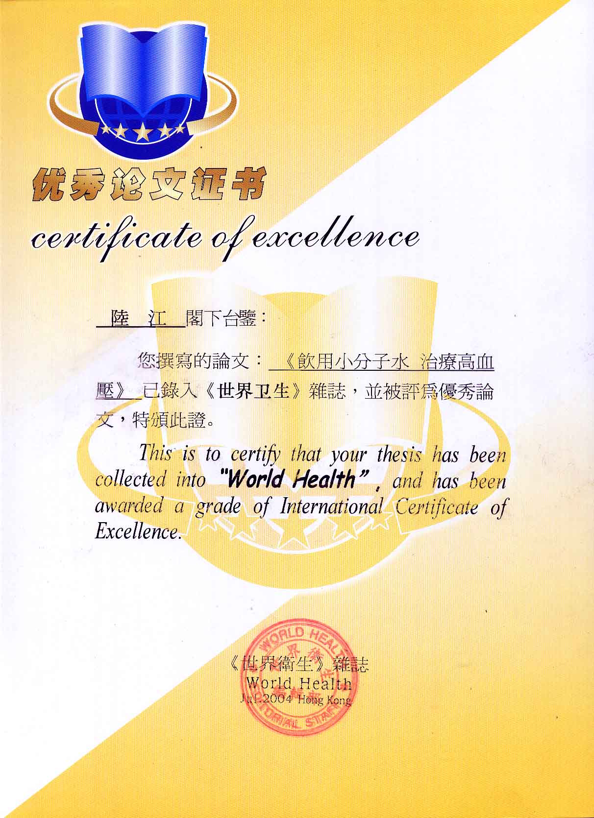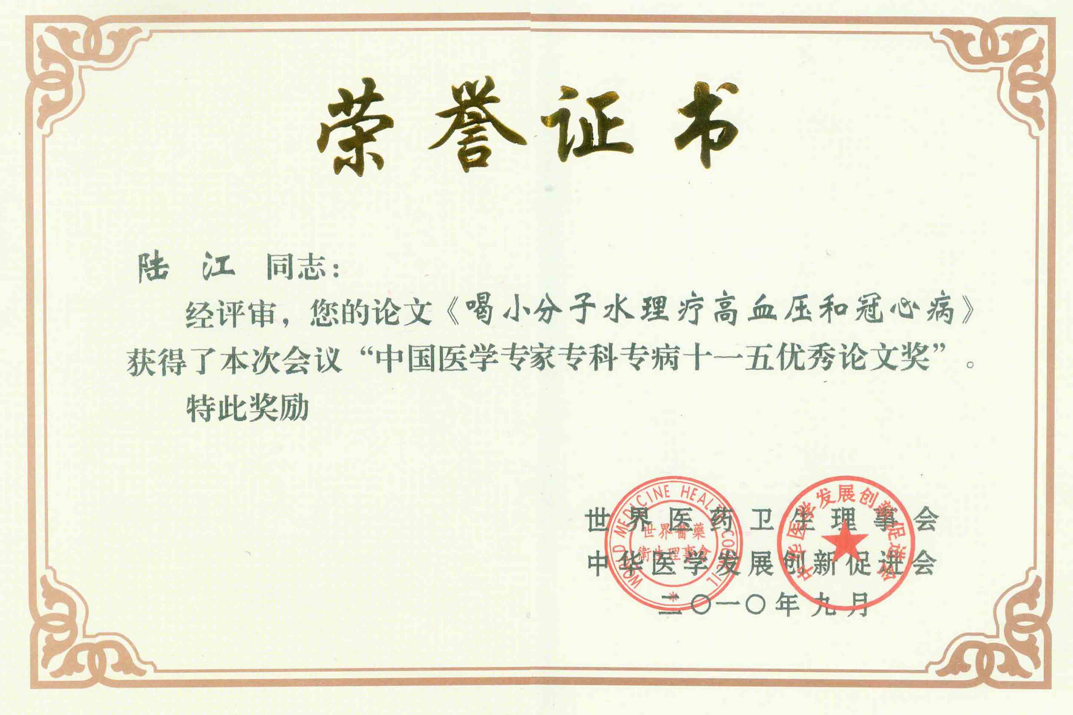 《飲用小分子水治療高血脂》獲優秀論文獎
